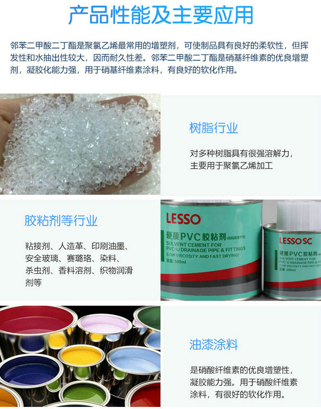鄰苯二甲酸二丁酯(DBP)是一種優良的增塑劑,是增塑劑中產量和用量最大的一類,屬通用型。對于多種樹脂具有很好的溶解能力,用作主增塑劑,具有色澤淺、毒性低、電性能好、揮發性低、氣味小和耐低溫等特點。