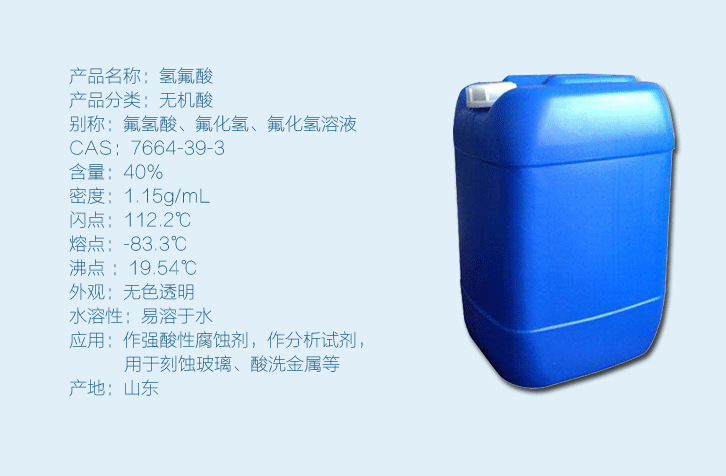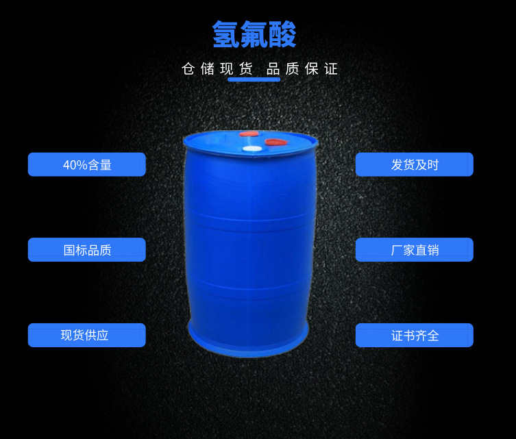 1.用于有機(jī)或無機(jī)氟化物的制造,如氟碳化合物、氟化鈉、氟化鋁、六氟化鈾和冰晶石等。也用于不銹鋼、非鐵金屬酸洗,玻璃儀表刻度、玻璃器皿和鏡子刻花、刻字,以及玻璃器皿拋光、磨砂燈泡和一般燈泡處理、金屬石墨乳除硅提純、金屬鑄件除砂、石墨灰分的去除、半導(dǎo)體(鍺、硅)的制造。也用作染料合成及其他有機(jī)合成的催化劑。還用于電鍍、試劑、發(fā)酵、陶瓷處理以及含氟樹脂和阻燃劑的制造等。在電子工業(yè)中用作強(qiáng)酸性腐蝕劑,可與硝酸、乙酸、氨水、雙氧水配合使用。